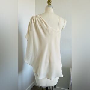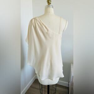 Worn once in Vegas for dinner. Truly amazing and elegant top! It has one covered shoulder with pleats to create a cape like look and a strap on the other shoulder to balance the top. Can easily be worn with a bra. Style is lined and doesn’t have any snags, no stains and no seam slippage. Great dressed up or casual.