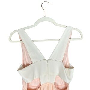 Make an unforgettable entrance in this blush pink formal gown by BCBGeneration. Designed with a deep V neckline and a crisp white contrast panel at the back, it delivers modern romance with timeless appeal. Smooth, structured drape—likely a viscose/poly blend—(no material tag) with full lining for a polished finish. Perfect for weddings, evening galas, or spring formals.