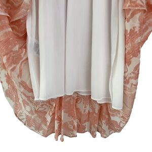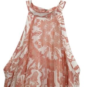 BCBGeneration Orange Peach and White Print Trapeze Sundress. White lining with Pleated Chiffon overlay.. 2 Hook and Eye Closure at neck.