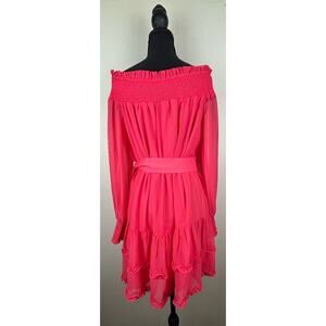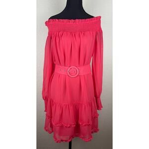 BCBGeneration Pink Ruffle Off the Shoulder Long Sleeved Dress. With belted waist. Size 6 NWT