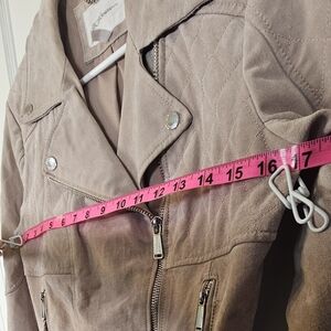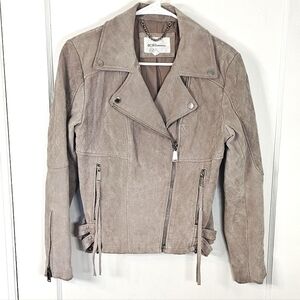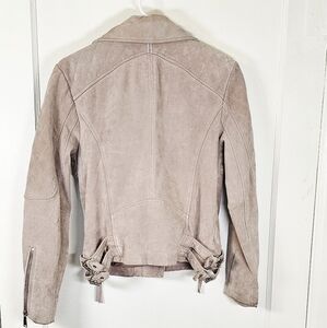 BCBGeneration light pink suede leather jacket featuring a front zipper, sleeve zippers, 2 zip-up pockets with partial braided pulls, double adjustable side buckles & a luxurious quilt pattern over the upper sleeves & back. Women's size medium, true to size. This jacket is soooo sweet!! There is a tiny mark along the collar, a slight discoloration spot on the front near the collar button which has a couple of scratches. Flaws are shown in the last 2 pics. Overall good condition though & leather cleaner will probably take out the small imperfections. Originally $598. Open to offers 🎉