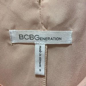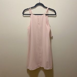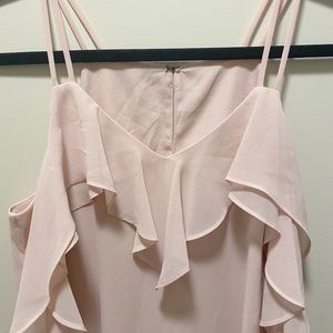 Self & Lining: 100% polyester. Fully lined. Ruffle trim. Back keyhole with hook and eye closure. Beautiful blush color. Size small. Excellent condition