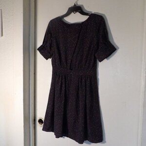 short puff sleeves have 3 button and loops , button at back neckline creates cut out center back , black with micro red hearts and polka dots in blue & white , lined , material is 100% Polyester for shell and lining , size 6 measurements are roughly 38" from shoulder to hem and about 20" pit to pit , Excellent used condition no issues , pet friendly non smoking home