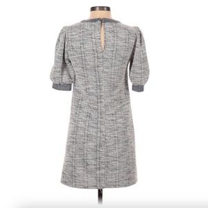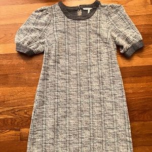 Cute and cozy puff sleeve BCBGeneration dress. Two hook/eye closures at back collar. Pull-on style shift dress. Marled knitted multicolor in black, grey, white, red, & blue.