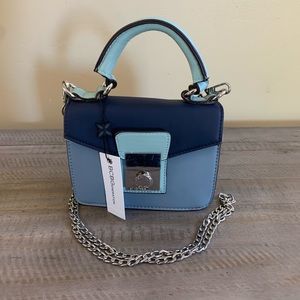 Bring cosmo-chic to your day with this color-blocked, faux-leather crossbody in rich midnight blue. Its rolled top handle and glossy chain shoulder strap offer carrying versatility.