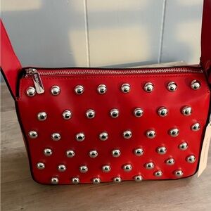 Bold red crossbody bag. Silver stud embellishments. Stylish and edgy design.