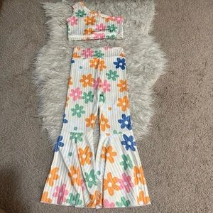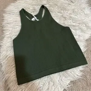 Chic two-piece matching set from BCBGeneration. Includes a ribbed olive green sleeveless crop tank top and a coordinating midi-length pencil skirt with bold black botanical print. Crafted from stretchy, form-fitting material for comfort and style. Perfect for casual wear, resort looks, or dressed-up nights out.