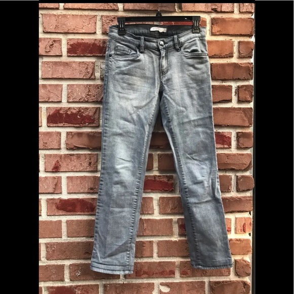 The outseam is 35.5 and the inseam is 28. Made out of 97% cotton and 3% spandex. The jeans are in good condition with no stain. It does have a small pull on the back of the left leg.