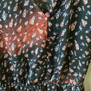EUC! Long sleeve romper with sheer top and lined shorts. Black and rust colors with floral print. Extra button still attached😀.