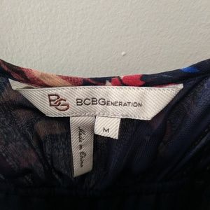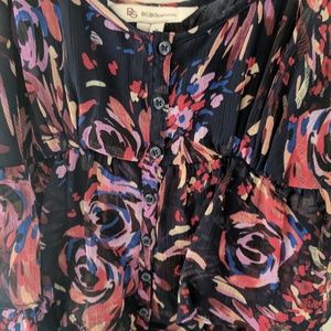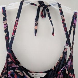 Knee length navy ruffle dress, with colorful swirl/flower pattern, adjustable spaghetti straps and buttons on front.