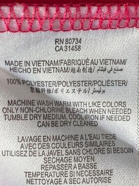 This berry pink colored dress features a faux-wrap style, a ruffled V-neckline, an elasticized waistband for a comfortable fit, snap closure at the V-neck, hidden slip pockets in the side seams, and a distinctive tie-back detail.