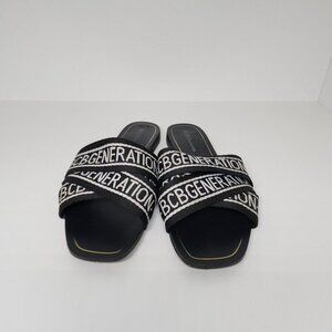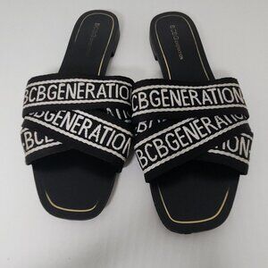 These sandals feature a black base with square open toes, crisscrossed wide fabric straps showcasing white “BCBGENERATION” logo text throughout, trimmed with gold detailing around the toe and heel area, and low-profile flat sole and slip-on design.
