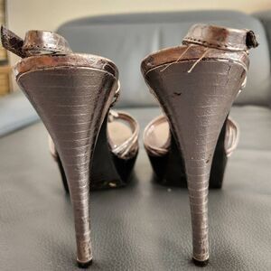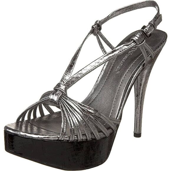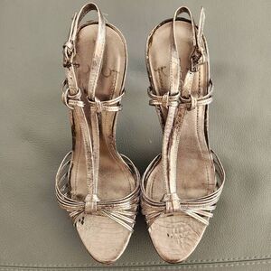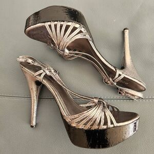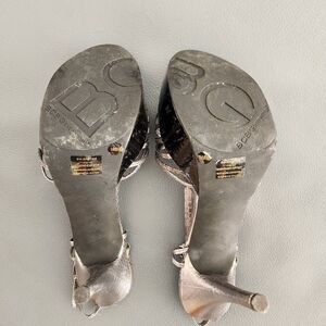 BCBGeneration Santos heeled leather sandal, silver pewter, sz 10
