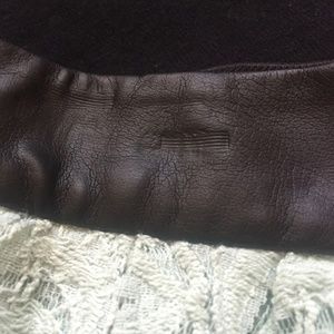 Adorable A-line mini skirt. Floral seafoam green lace pattern, fully lined. Faux leather, elastic waistband.