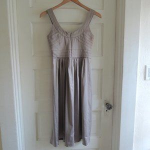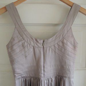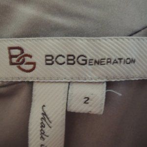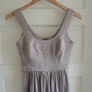 BCBGeneration silvery gray sleeveless dress, size 2. Ethereal, shimmery dress has a scoop neck, fitted bodice with gathered waist, and flowy, full lower portion. Bodice is lined and very lightly padded, with quilted-style stitching detail. Back zip closure. No fabric tag, has satin feel. Simple, understated, and classy, ideal for prom, event, party. Extremely faint mark on lower right neckline (last pic) is barely visible. Otherwise very good gently pre-owned condition.
