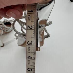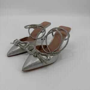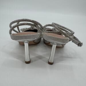 Sparkling silver rhinestone pumps with a metallic finish, elegant pointed toe silhouette, sleek stiletto heel for a dressy look, perfect for parties or special occasions, size 7.5, glamorous and eye-catching