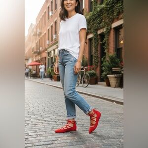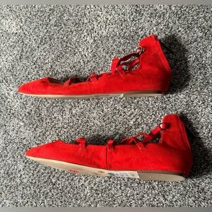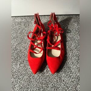 BCBGeneration Size 8.5 Red Suede Strappy Ballet Flats Back Zip NWT R $99