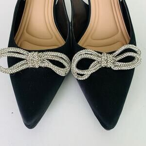 Rhinestone bow, buckle closure, pointed toe