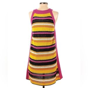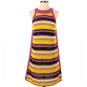 Brighten up your wardrobe with this playful BCBGeneration shift dress, perfect for sunny days and festival vibes. Featuring a bold graphic stripe pattern in cheerful yellow with pops of pink, black, and white, this knit dress brings effortless style and comfort. The sleeveless silhouette and crew neckline create a flattering, easy-to-wear shape — just add sandals or boots and you’re ready to go.