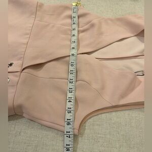 Gently used BCBGeneration romper in dusty pink. Features a skort design with lace-up grommet detailing on the lower front hem, a low V crossover front with snap closure, and a tank design. Includes a hidden back zipper with a hook-and-eye neck closure. Machine washable. Approximate flat lay measurements are pictured. There is a small surface spot on the front that I have not tried to remove. Smoke-free home.