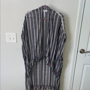 Chic striped wrap with ruffle details, raw edge, and crochet detail.