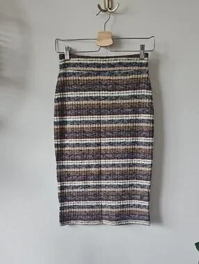 Slim pencil silhouette with horizontal ribbed stripes. Stretch knit fabric for a snug, comfortable fit. Neutral and gray tones work well for day or night looks.
