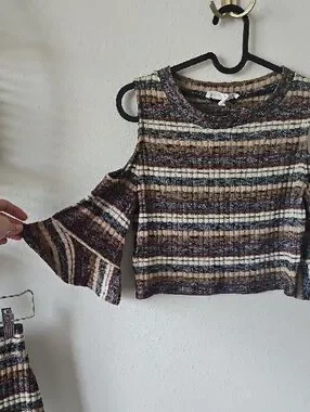 Paired with a cropped cold-shoulder top with 3/4 sleeves.