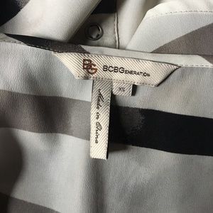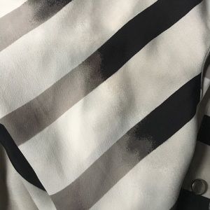 Black/Grey/White Ombré stripes. Halter can be worn 2 ways - both straps tied around neck or skinny straps around neck and wider straps tied in front or loose down the front. Buttons up the front. 100% polyester. Like new.