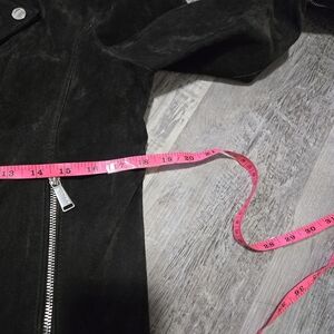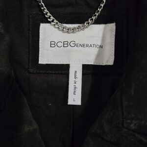 This is a BCBGeneration brand women's leather jacket. Size Large. It's a dark brown, soft leather suede material. The outer layer is 100% leather while the inner layer is 100% cotton. It has long sleeves and a mid waist length body. It's been worn a few times but still in good condition. There are a few wear marks in the front area (seen in pics) but they blend in with the pattern of the suede material.