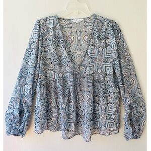 BCBGeneration Sz L Sheer Blue Paisley V Neck Blouse Top Loose Fit