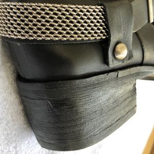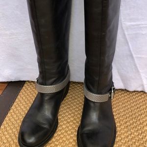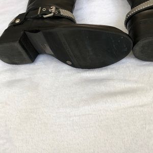 BCBGeneration Tall Black Boot Size 7.5M. These boots have very few visible imperfections. The sole and heel are in great shape with minimal signs of wearing. Silver chain circles the ankle. Nice dressy boot for winter. Leather upper and man made balance.