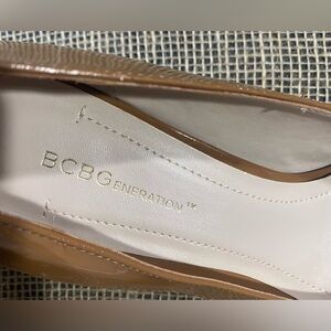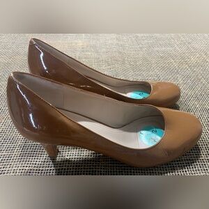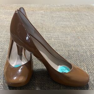 BCBGeneration Tan Patent Leather Heels, Size 8.5, Round Toe Moderate Heel