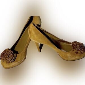2025 fall suede is in BCBGeneration Tan Suede Leather Platform Heels Gold Studded Vamp Rosettes 9.5