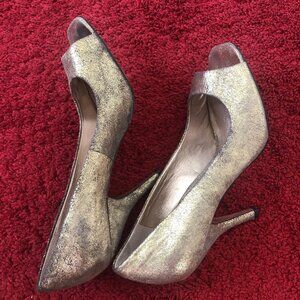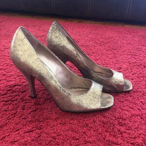 Peep toe, tarnished metallic gold leather 4.25" high heels shoes.