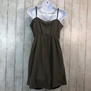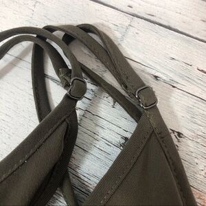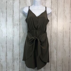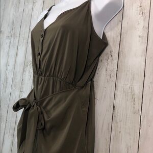 Olive green, adjustable spaghetti straps, tie front flaps, elastic waist, has some spots may come out in wash, buttons for design purpose only, colors may vary due to lighting, NWT, Size: M