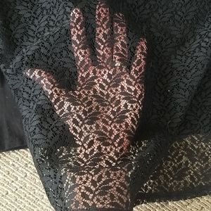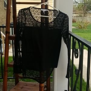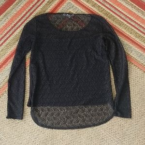 Excellent used condition. Sheer sleeves, back, and upper neck area. The back is slightly longer than the front. Measures 16 inches pit to pit, 20 inches from the top of the shoulder to the bottom FRONT hem, 25 inches from the back of the neck to the bottom of the BACK hem.