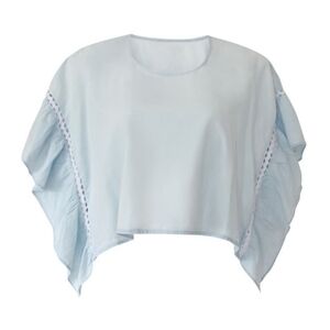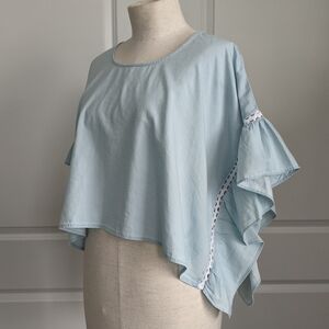 Rounded neckline. Rectangular silhouette. Cropped straight hemline. Ruffled short sleeves with white eyelet trim. Chambray fabric. Slips on over head.