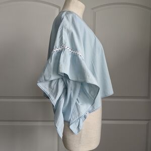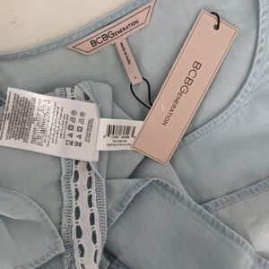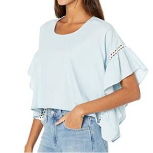 BCBGeneration Top Cropped Ruffled Short Sleeve White Eyelet Chambray Blue L NWT