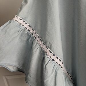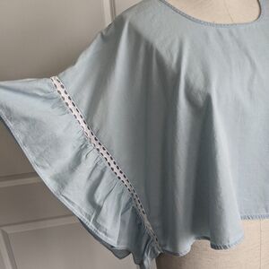 Rounded neckline. Rectangular silhouette. Cropped straight hemline. Ruffled short sleeves with white eyelet trim. Chambray fabric. Slips on over head.