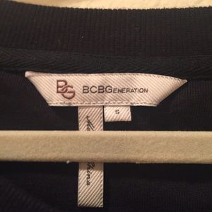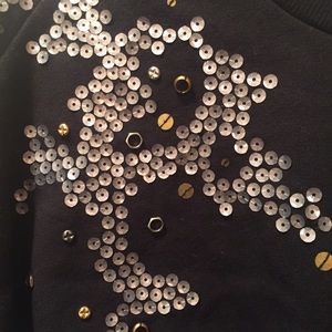 Size S. BCBGeneration short-sleeved sweatshirt material top. Black with gold, blue, grey sequins on one sleeve.