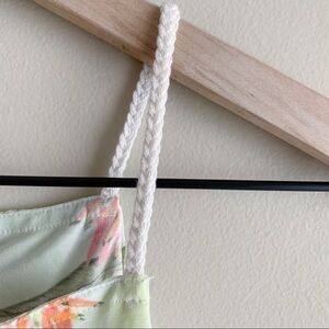 Tropical print tank top featuring a flowy sheer chiffon overlay, long side slits, braided rope-like shoulder straps, square neckline, partially lined (at bust).