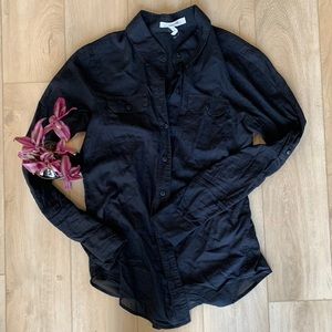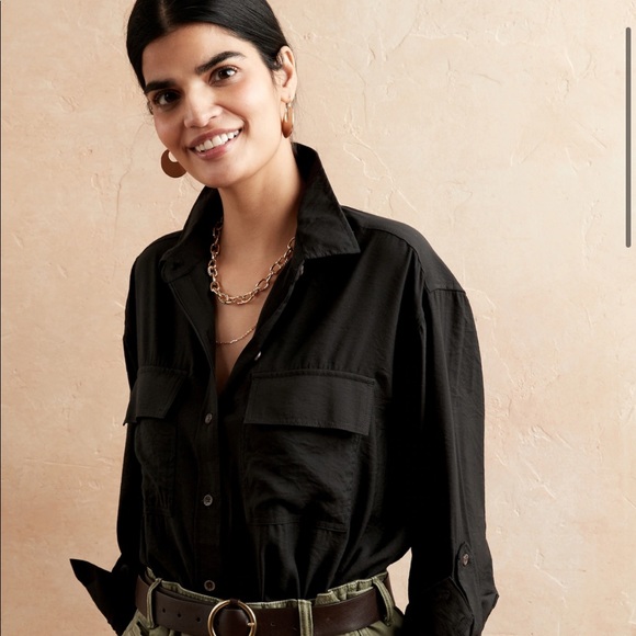 BCBGeneration Utility Shirt. Button pockets on the chest, sleeve tabs for rolling, and two button closure on sleeves. Lightweight and great for casual layering! First photo is a similar utility shirt. Color black.