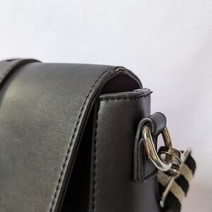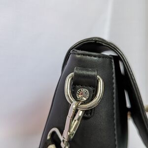 This vegan leather crossbody bag is stunning! The design details on the front set this bag apart from other bags! The woven shoulder straps says that it's a formal bag but it's here to party. The front twist clasp is a little tarnished from wear but otherwise this purse is invvery good condition. There is a little damage to the edge of the front flat where the strap rubs against the leather. I repaired some of it but it may rub off again due to natural wear. The back features a zip pocket with a cute zipper pull and inside you'll find a zip pocket and one large slip pocket.