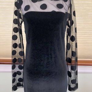 BCBGeneration Black Velvet Polka Dot & Mesh Open Back Dress. Excellent pre-owned condition, no flaws or stains.