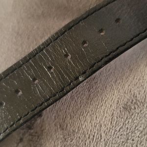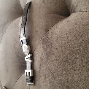 BCBGeneration Black leather watch. Worn a couple of times. Love letters slide (other than O). Needs new battery. Only flaw shown in pic.