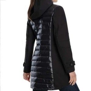Stay warm and dry in this hooded mixed media jacket featuring a water-resistant softshell exterior with puffer panels in a stylish longline silhouette.