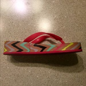 BCBGeneration Wedge Flip Flops multi colored chevron striped bottom w pink top