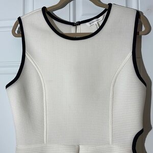 Chic white romper with black trim. Sleeveless design. Perfect for any occasion.