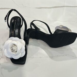 Step out in style with these BCBGeneration sandals. Featuring a striking black and white floral design, these shoes are perfect for any occasion. Enjoy comfort and elegance with every step. Padded insole with memory foam, heel height 3.5 inches, square toes with adjustable ankle strap. New without box & tag.