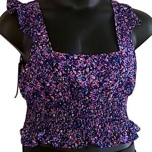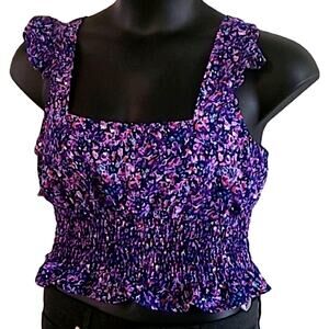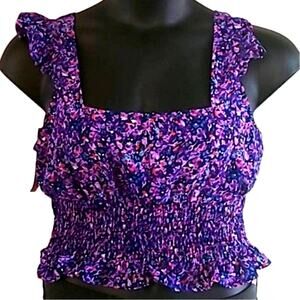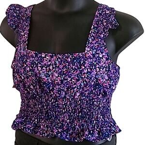 BCBGeneration top, floral crop blouse, smocked ruffle tank, sleeveless summer shirt, women’s festival top, square neckline top, NWT BCBG, purple floral blouse, size large crop top